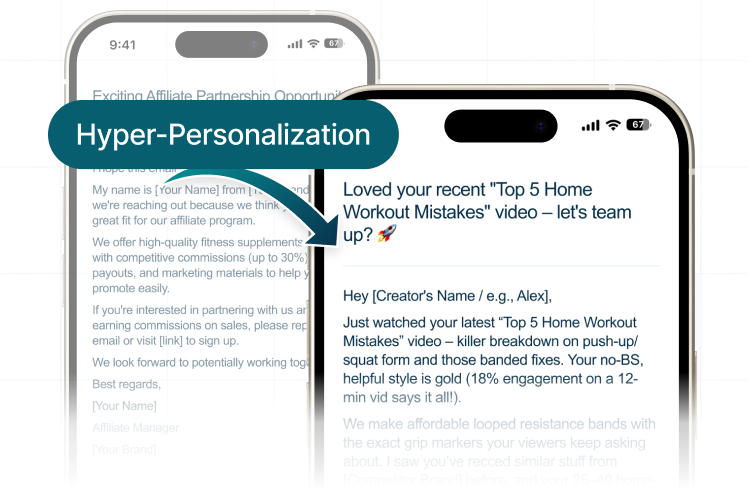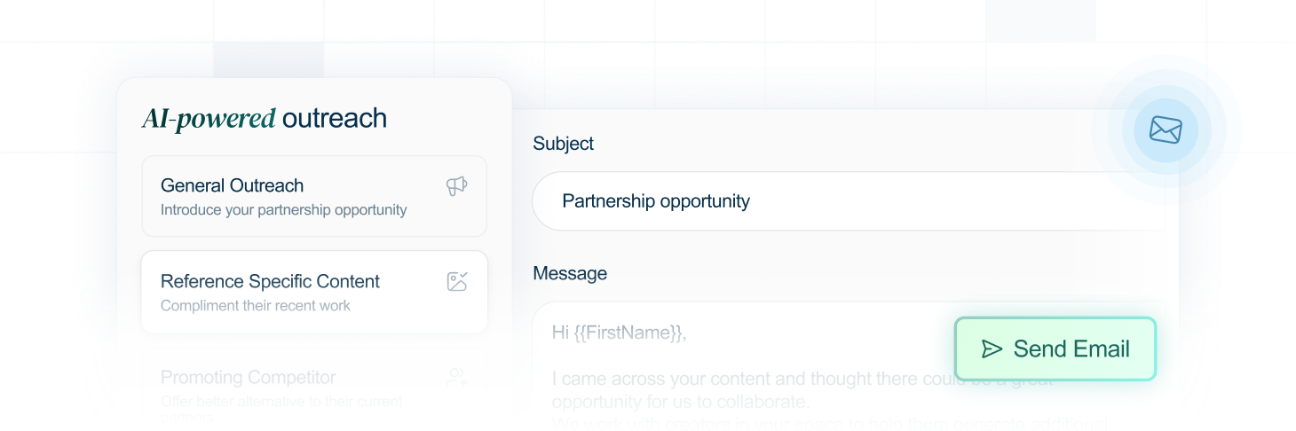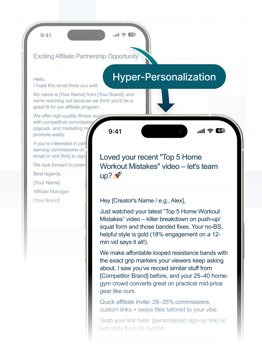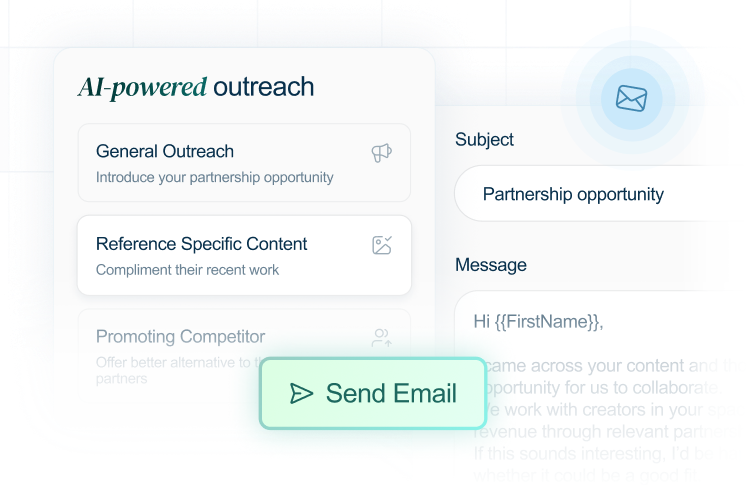 Our AI analyzes each affiliate's public content — YouTube videos, blog posts, social media — and writes outreach that references their specific work. It's not just {first_name} merge fields; it's genuine personalization based on what they actually create. You can edit the drafts or send as-is.