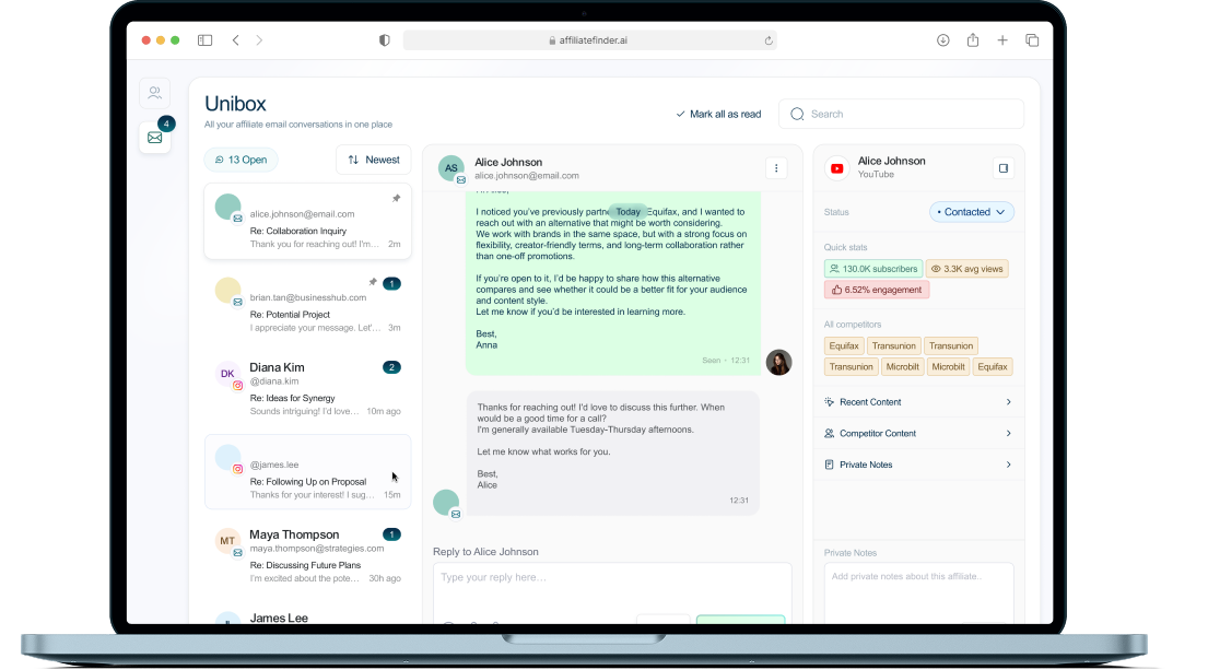 If you're managing outreach from multiple email accounts, the Unified Inbox brings all conversations into one place. Filter by affiliate, campaign, or status - and never miss a reply.