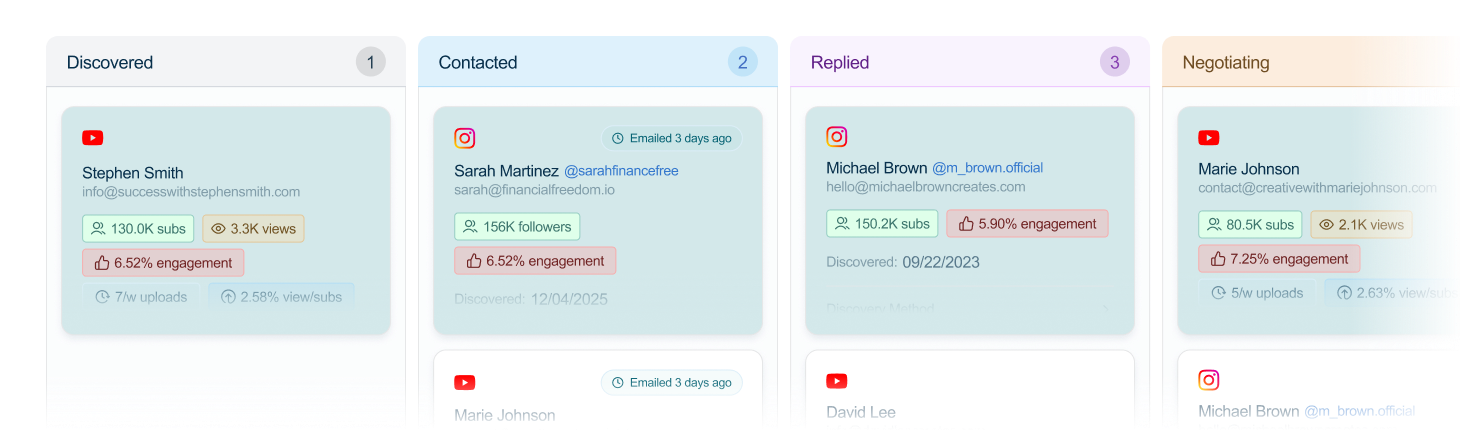 Our visual Kanban CRM lets you track affiliates through customizable stages: Discovered → Contacted → Replied → Negotiating → Active Partner. If an affiliate responds, the status automatically updates, and you can also drag and drop to update their status, add notes, and see your entire pipeline at a glance.